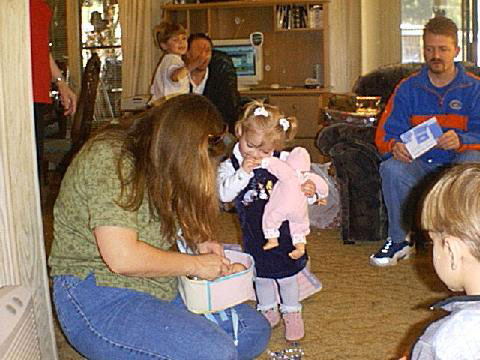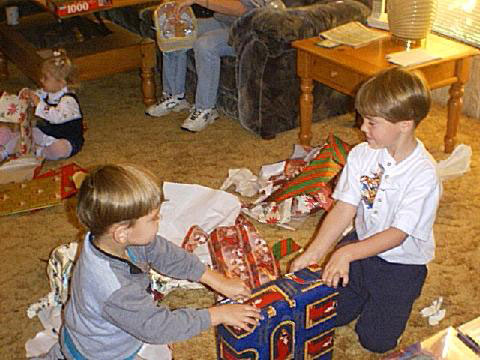 Julia, Joshua, and Jimmy opening gifts. |