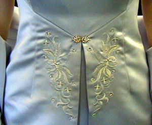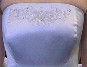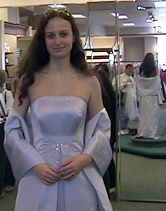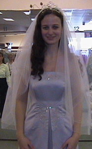 Closeup of veil/tiara. | Profile of huge nose. | I really like this veil a lot. I like the way it drapes. It has silver threading around the edges and rhinestones randomly scattered all over it. It's just rediculously expensive! |