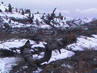 The beginning of the Craters of the Moon lava field. | 1350 year old tree limb that established the age of the North Crater eruption. |