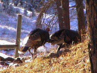 Prairie dogs, one digging a new hill while the other supervises. | Wild Turkeys (non-alcoholic) ignoring Randal's mating calls. |