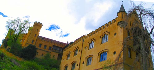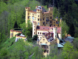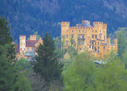 View of Hohenschwangau with surroundings. Hohenschwangau from near Mary's Bridge. Neuschwanstein from near Mary's Bridge.