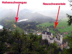Neuschwanstein from Mary's Bridge. Hohenschwangau from mountain above Neuschwanstein.