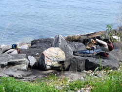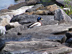 Mallard on the rocks. |