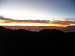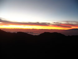 Sunrise atop Haleakala volcano; full moon setting over the other side of the volcano. | ||